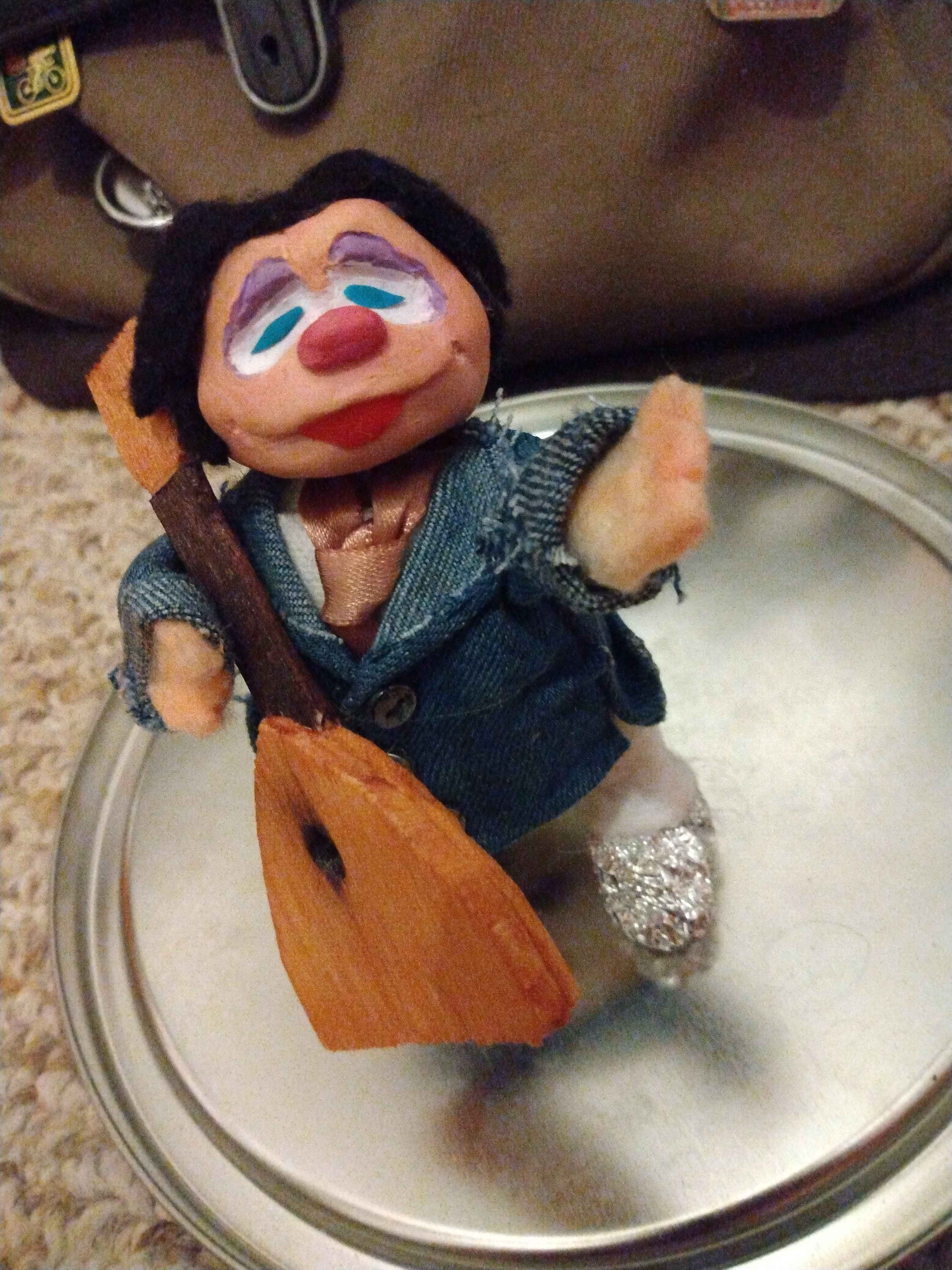 Denny Puppet Update 4 [23 Dec. 2025]He's got his instrument! (Or at least the bare bones of it.) Really didn't feel like doing any sewing today, so I worked on other stuff. I colored his hands to match his face, and added a little brown to his hair to make it a little bit more nuanced than just JET BLACK. I also added washers to the bottom of his feet so he can stand up a lot easier using magnets hidden in the floor. In the pics I've got him on the lid of a tin, but that's just temporary to test out the idea. The balalaika I made out of balsa wood. Kinda a bad choice of material, but it's what I had lol. ![]() I like this picture, he looks like a grateful little mouse lol. I was testing out neck up/down movement and decided to snap a pic. ![]() And here he is just chillin'. With his balalaika. (What a fun word to say, by the way... Ba-la-lai-ka. Good stuff.) "Cute cute. I am getting way too into this project lol."